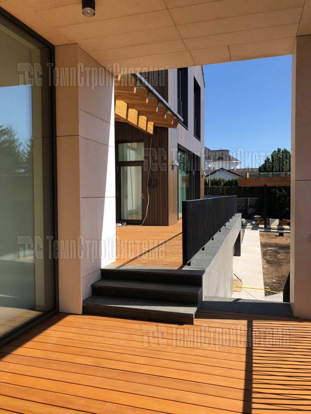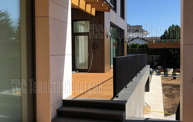 Устройство гидроизоляции плоской эксплуатируемой кровли мембраной Резитрикс СК-В (Resitrix SK-W) и Резитрикс Классик (Resitrix Classic), с проведением гидротеста. В качестве финишного покрытия был выбран настил из террасной доски на регулируемых опорах.