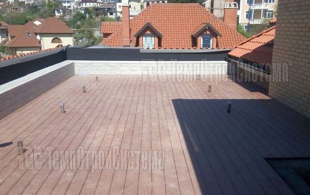 Устройство гидроизоляции плоской эксплуатируемой кровли мембраной Резитрикс СК-В (Resitrix SK-W) и Резитрикс Классик (Resitrix Classic), с проведением гидротеста. В качестве финишного покрытия был выбран настил из террасной доски на регулируемых опорах.